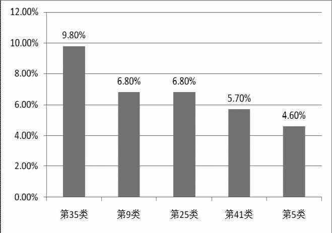 從上圖可以看出,第35類的申請量遠(yuǎn)遠(yuǎn)高于排名第二的第9類及第25類的申請量,事實(shí)勝于雄辯,第35類在全球申請量排名第一,所以作為我們中國企業(yè),對于第35類的保護(hù)也一樣要重視起來。