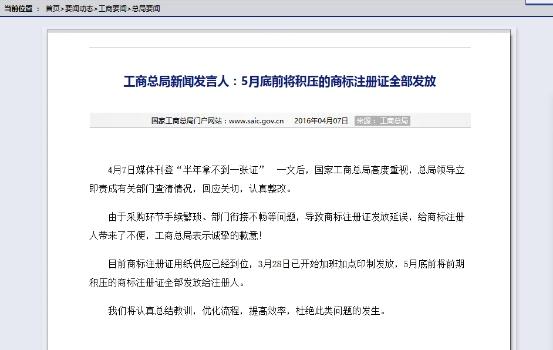 工商總局新聞發(fā)言人:5月底前將積壓的商標注冊證全部發(fā)放