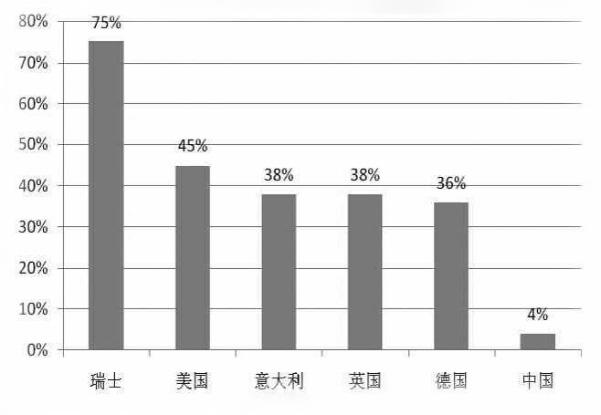 ??而與此形成強(qiáng)烈對比的是,瑞士的商標(biāo)申請中75%是國際商標(biāo),其他國際商標(biāo)占比較高的國家還有美國(45%)、意大利(38%)、英國(38%)和德國(36%)。