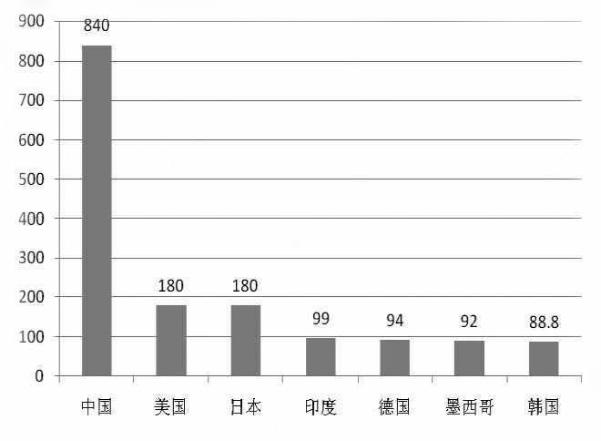 圖1:2014年全球商標(biāo)申請量前5位的國家(地區(qū))?單位:萬件;
